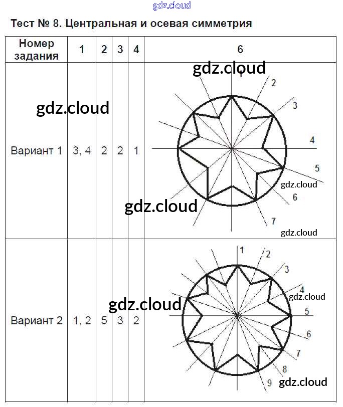 Ответ на задание Тест №8. Центральная и осевая симметрия Контрольно-измерительные материалы (КИМ) Геометрия за 8 (восьмой) класс Рязановский, Мухин 2014
