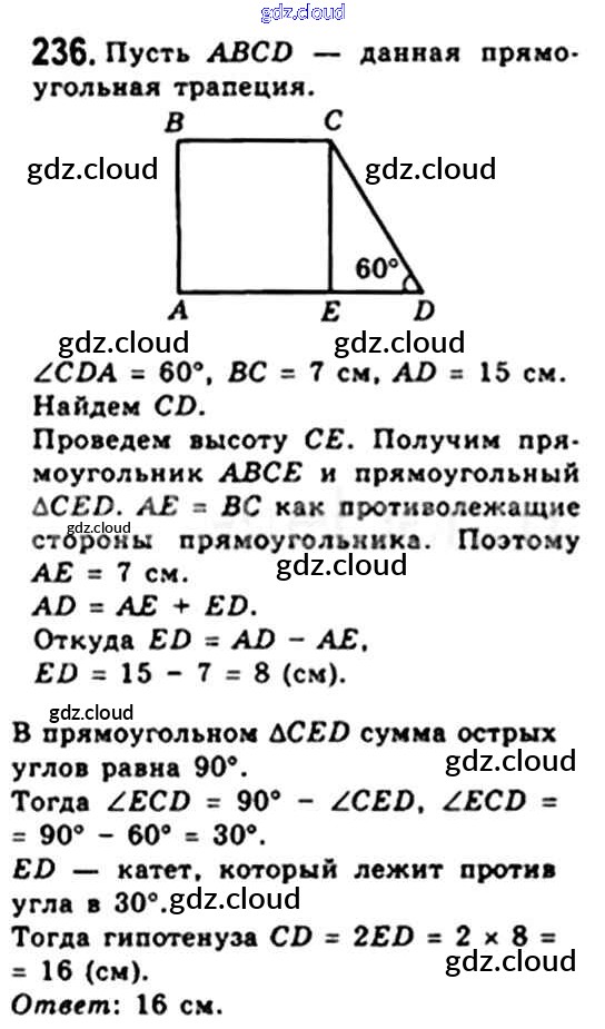 Ответ на задание 236 Учебник Геометрия за 8 (восьмой) класс Мерзляк, Полонский, Якир Алгоритм успеха 2015