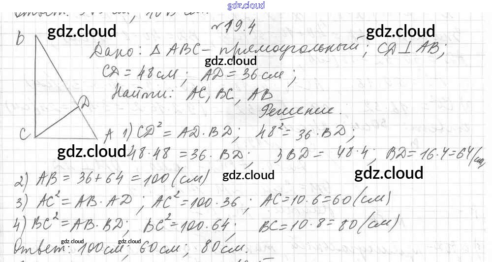 § 19. Метрические соотношения в прямоугольном треугольнике Ответы к Главе 4. Решение прямоугольных треугольников по Геометрии 8 класс Учебник Мерзляк Алгоритм успеха Углубленный уровень Вентана-граф