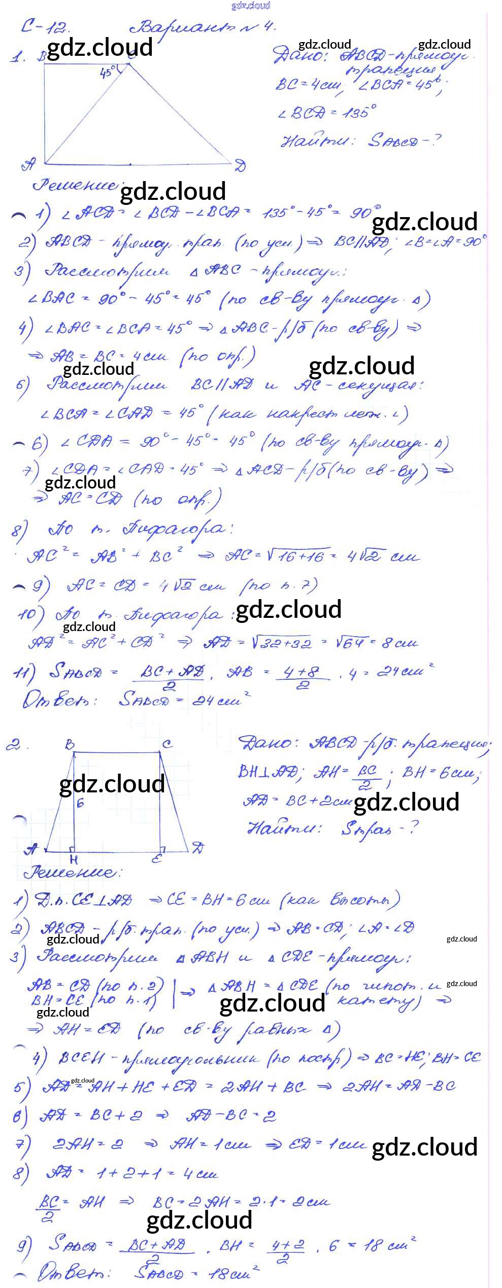 СР №12. Площадь трапеции Ответы к Самостоятельным работам по Геометрии 8 класс Дидактические материалы Зив Просвещение