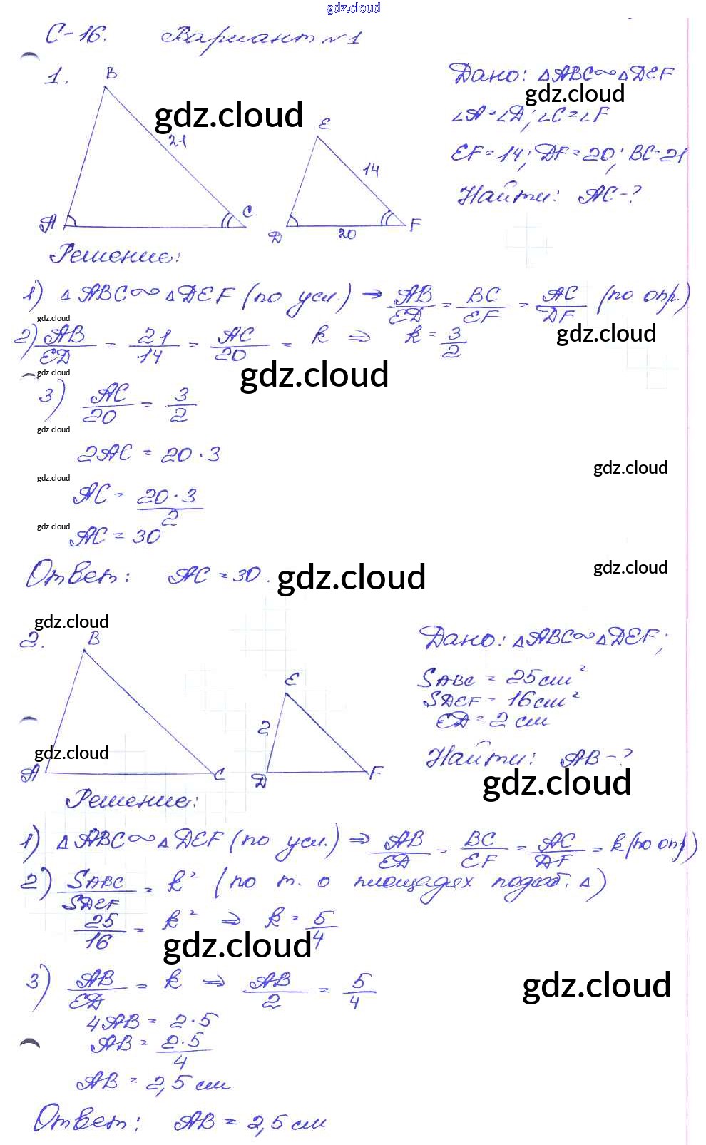 СР №16. Определение подобных треугольников Ответы к Самостоятельным работам по Геометрии 8 класс Дидактические материалы Зив Просвещение