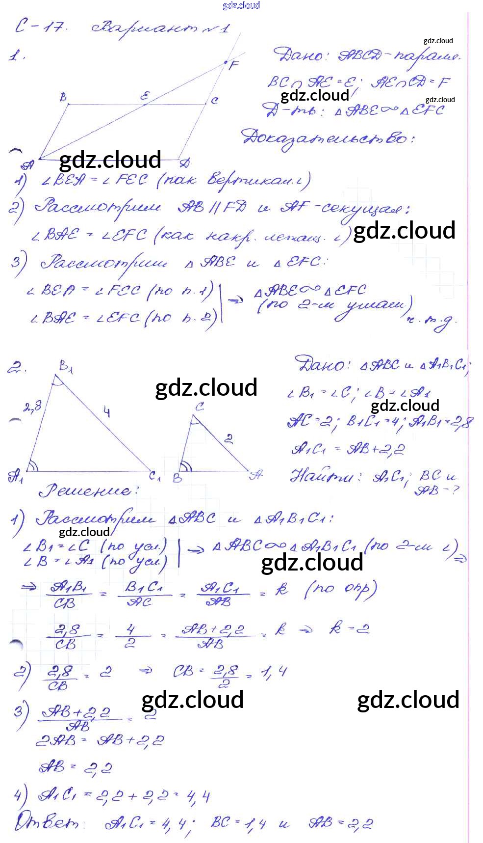 СР №17. Первый признак подобия треугольников Ответы к Самостоятельным работам по Геометрии 8 класс Дидактические материалы Зив Просвещение
