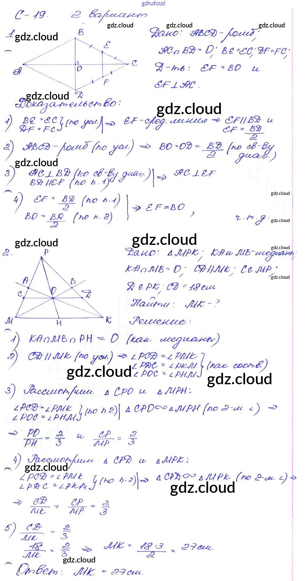 СР №19. Средняя линия треугольника. Свойства медиан Ответы к Самостоятельным работам по Геометрии 8 класс Дидактические материалы Зив Просвещение