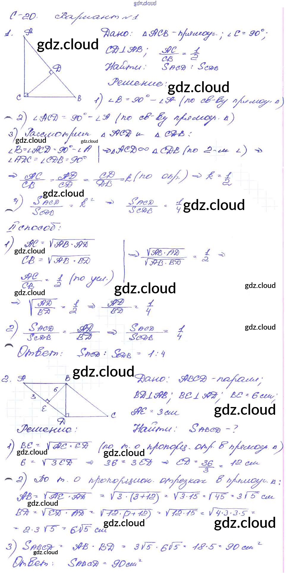 СР №20. Пропорциональные отрезки в прямоугольном треугольнике Ответы к Самостоятельным работам по Геометрии 8 класс Дидактические материалы Зив Просвещение