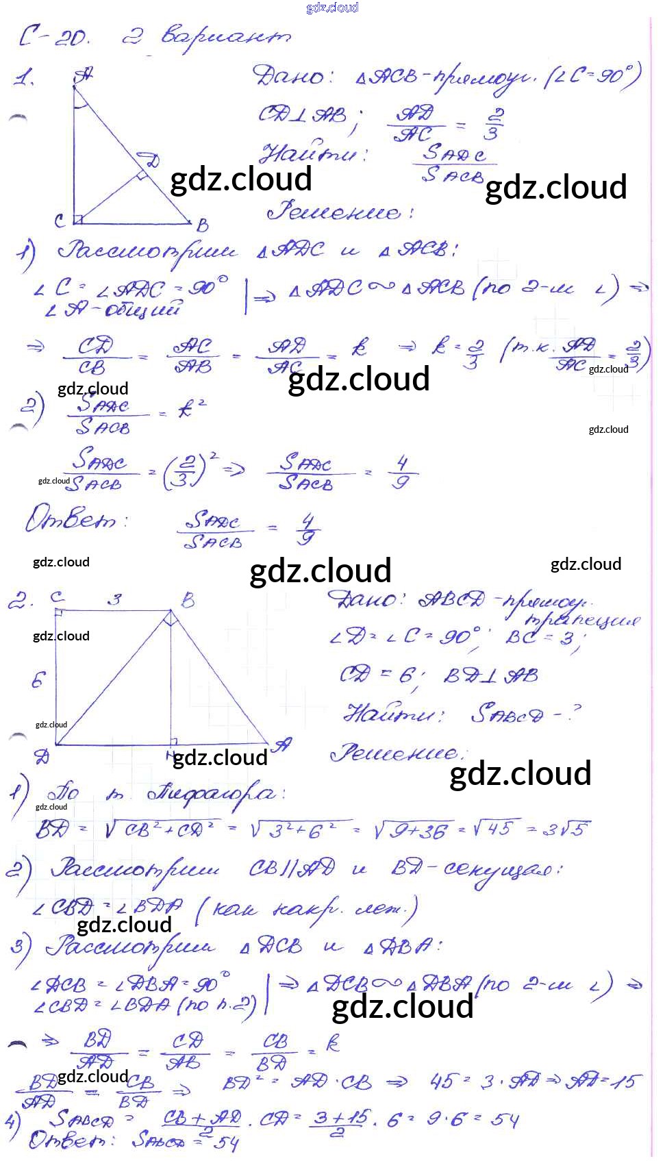 СР №20. Пропорциональные отрезки в прямоугольном треугольнике Ответы к Самостоятельным работам по Геометрии 8 класс Дидактические материалы Зив Просвещение