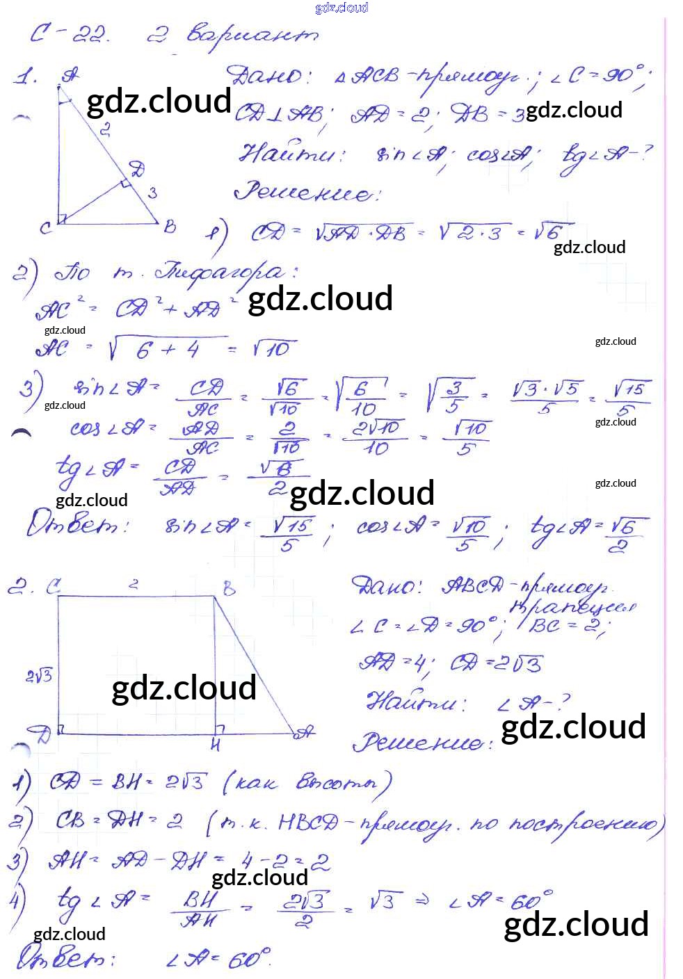 СР №22. Синус, косинус и тангенс острого угла треугольника Ответы к Самостоятельным работам по Геометрии 8 класс Дидактические материалы Зив Просвещение