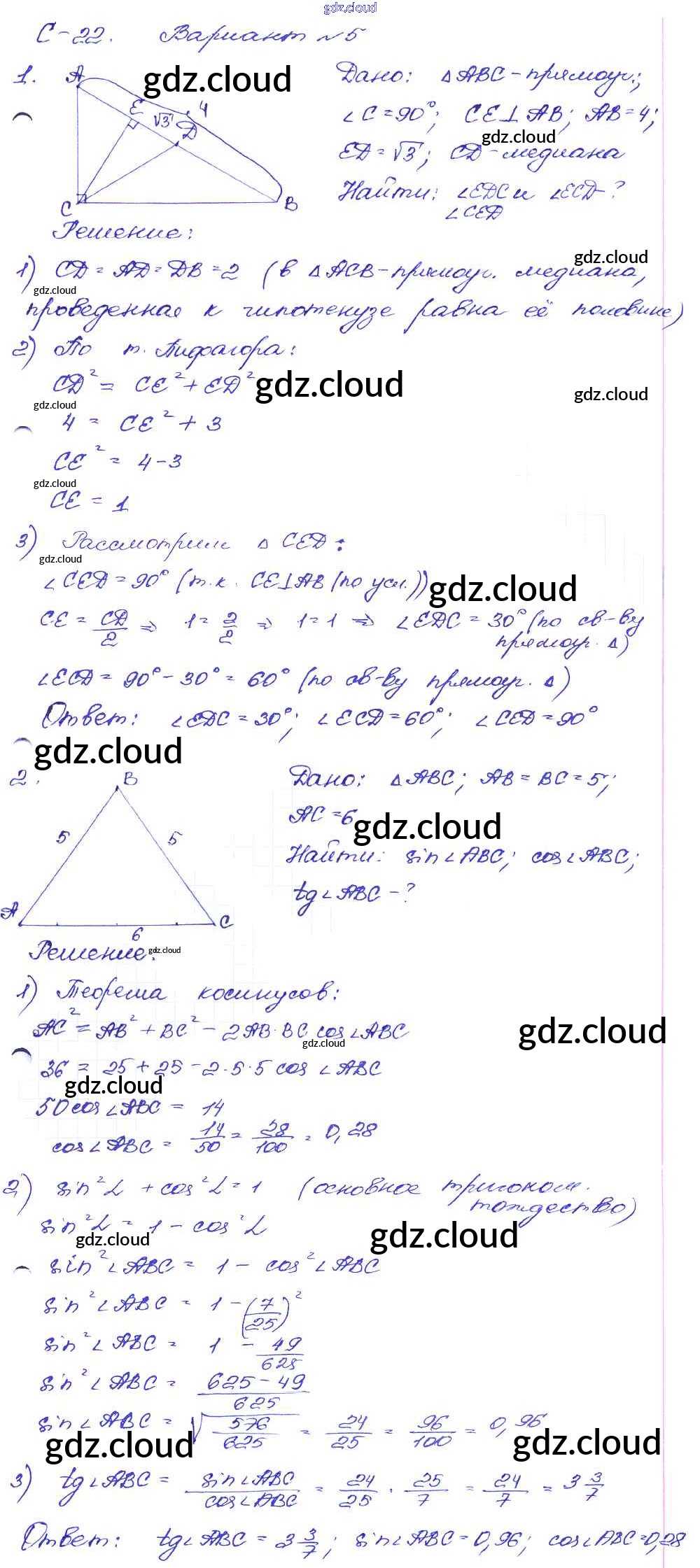 СР №22. Синус, косинус и тангенс острого угла треугольника Ответы к Самостоятельным работам по Геометрии 8 класс Дидактические материалы Зив Просвещение