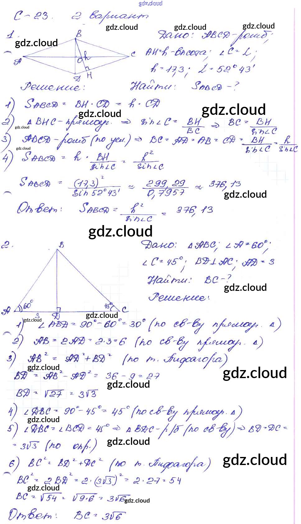 СР №23. Решение прямоугольных треугольников Ответы к Самостоятельным работам по Геометрии 8 класс Дидактические материалы Зив Просвещение