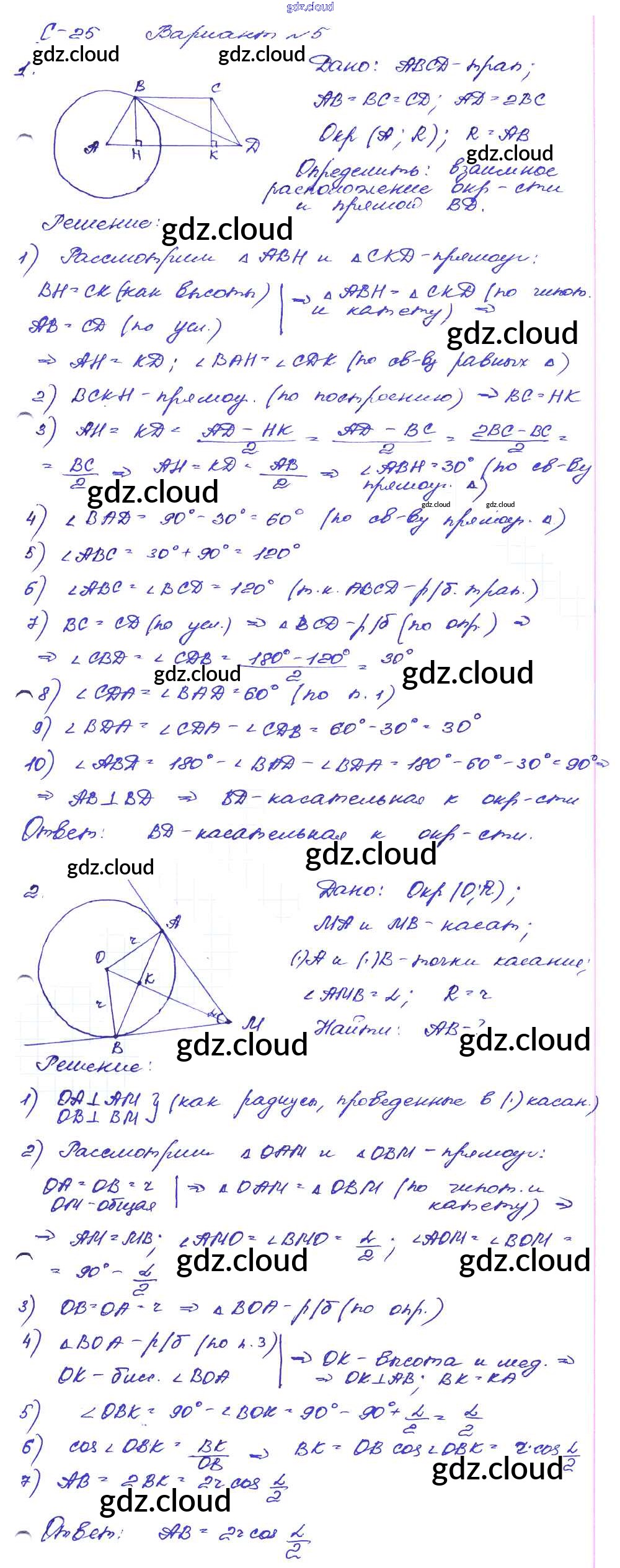 СР №25. Взаимное расположение прямой и окружности Ответы к Самостоятельным работам по Геометрии 8 класс Дидактические материалы Зив Просвещение