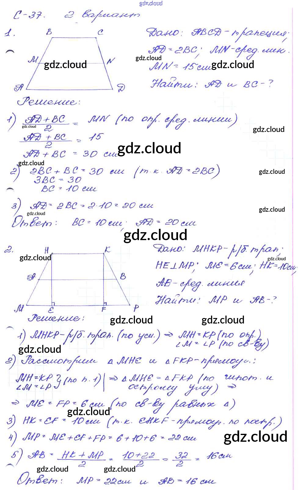 СР №37. Средняя линия трапеции Ответы к Самостоятельным работам по Геометрии 8 класс Дидактические материалы Зив Просвещение
