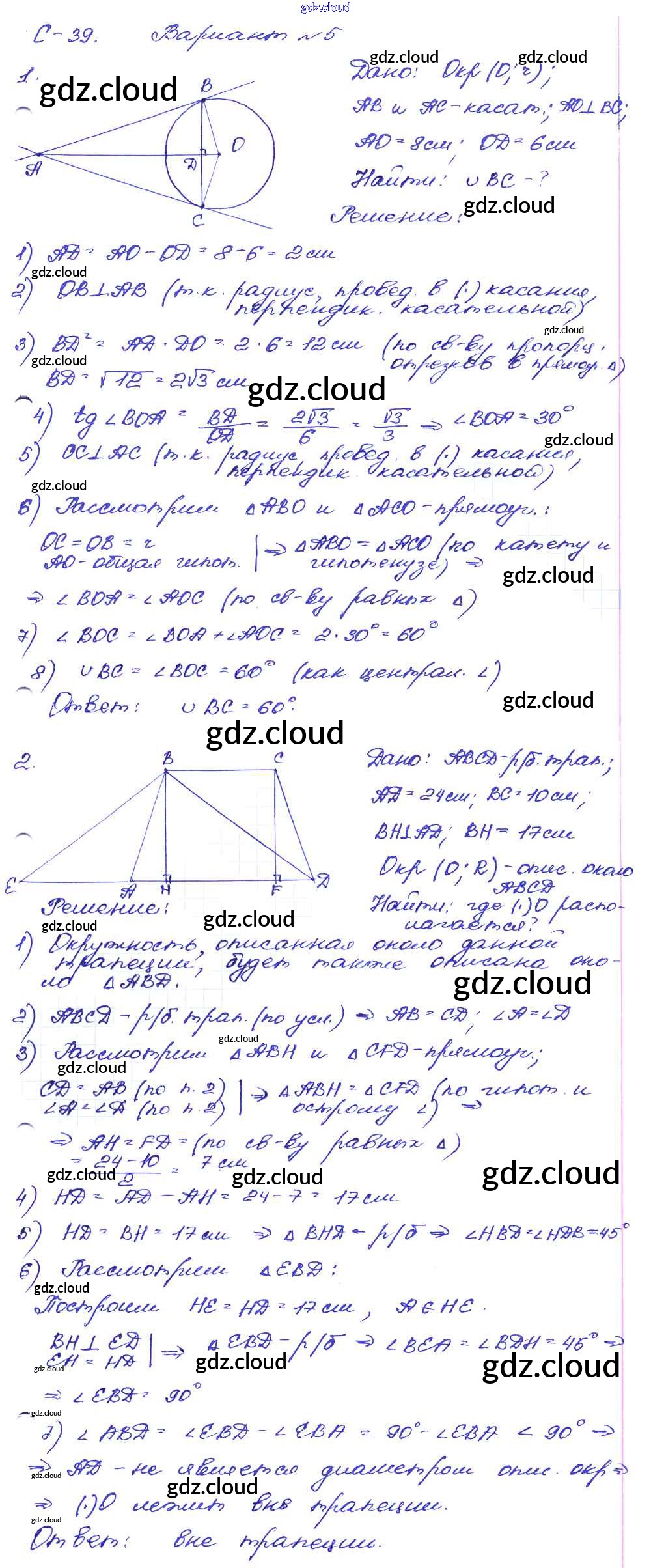 СР №39. Итоговое повторение (окружность) Ответы к Самостоятельным работам по Геометрии 8 класс Дидактические материалы Зив Просвещение