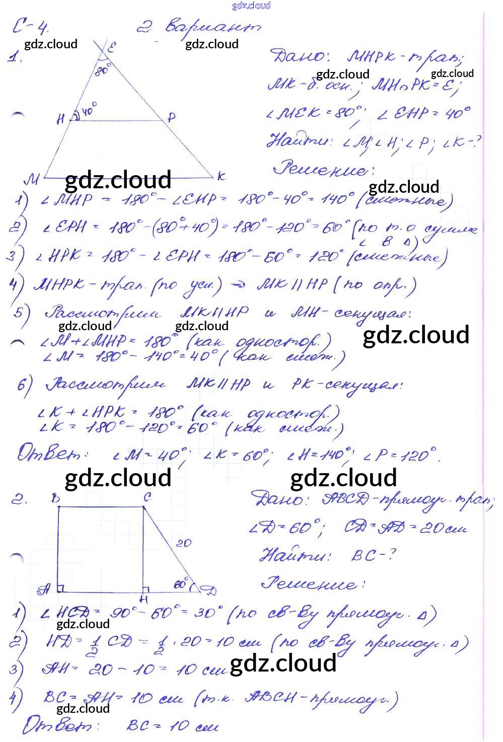 СР №4. Трапеция Ответы к Самостоятельным работам по Геометрии 8 класс Дидактические материалы Зив Просвещение