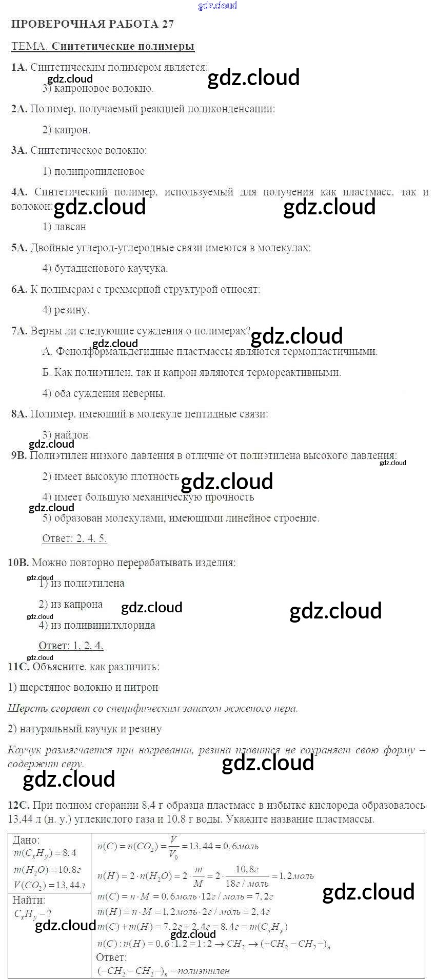 Ответ на задание 27 Тетрадь для оценки качества знаний Химия за 10 (десятый) класс Габриелян, Купцова 2014