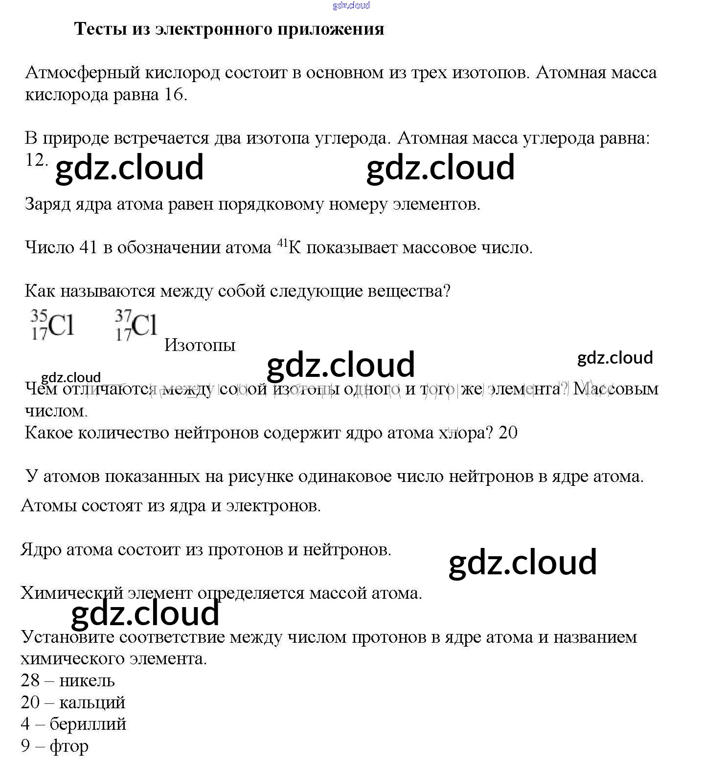 Тестовые задания Ответы к § 1. Химический элемент. Нуклиды. Изотопы по Химии 11 класс Учебник Рудзитис Базовый уровень Просвещение