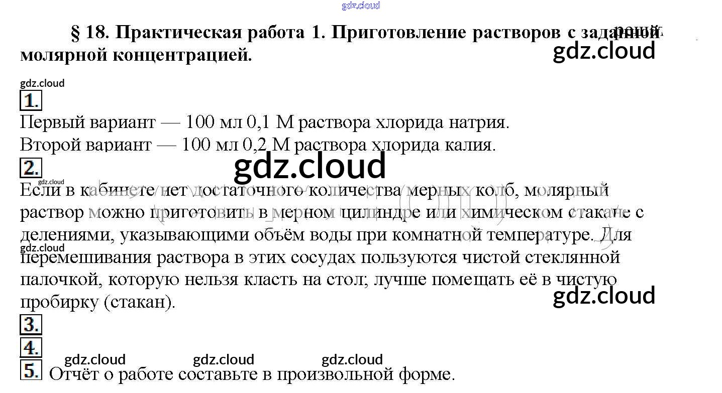 Практическая работа 1. Приготовление растворов с заданной молярной концентрацией Ответы к § 18. Практическая работа 1. Приготовление растворов с заданной молярной концентрацией по Химии 11 класс Учебник Рудзитис Базовый уровень Просвещение