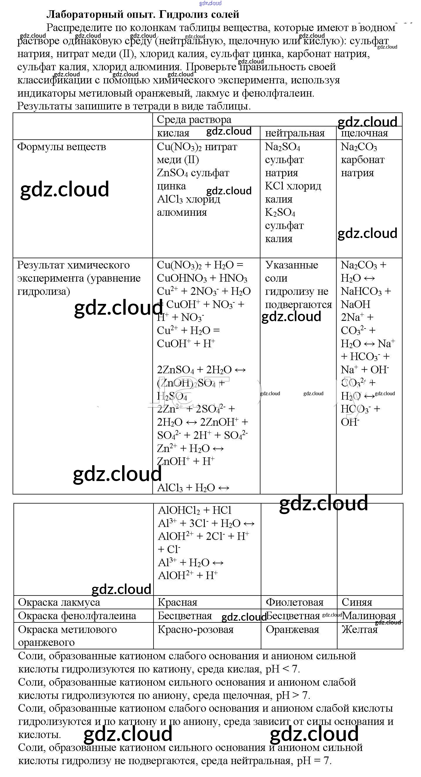 Лабораторный опыт. Гидролиз солей Ответы к § 21. Гидролиз органических и неорганических соединений по Химии 11 класс Учебник Рудзитис Базовый уровень Просвещение