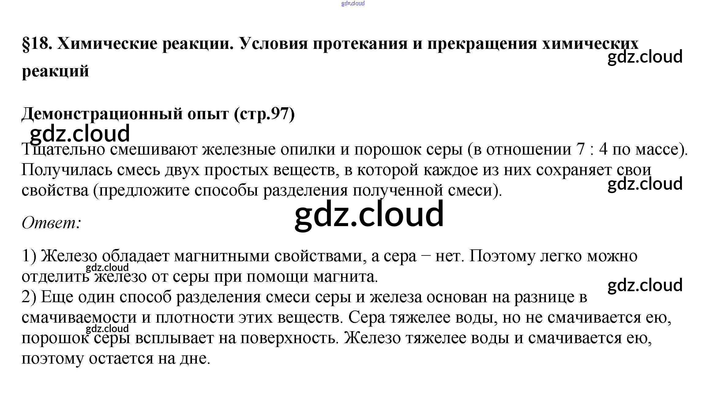 Демонстрационный опыт Ответы к §18. Химические реакции. Условия протекания и прекращения химических реакций по Химии 7 класс Учебник Габриелян Дрофа
