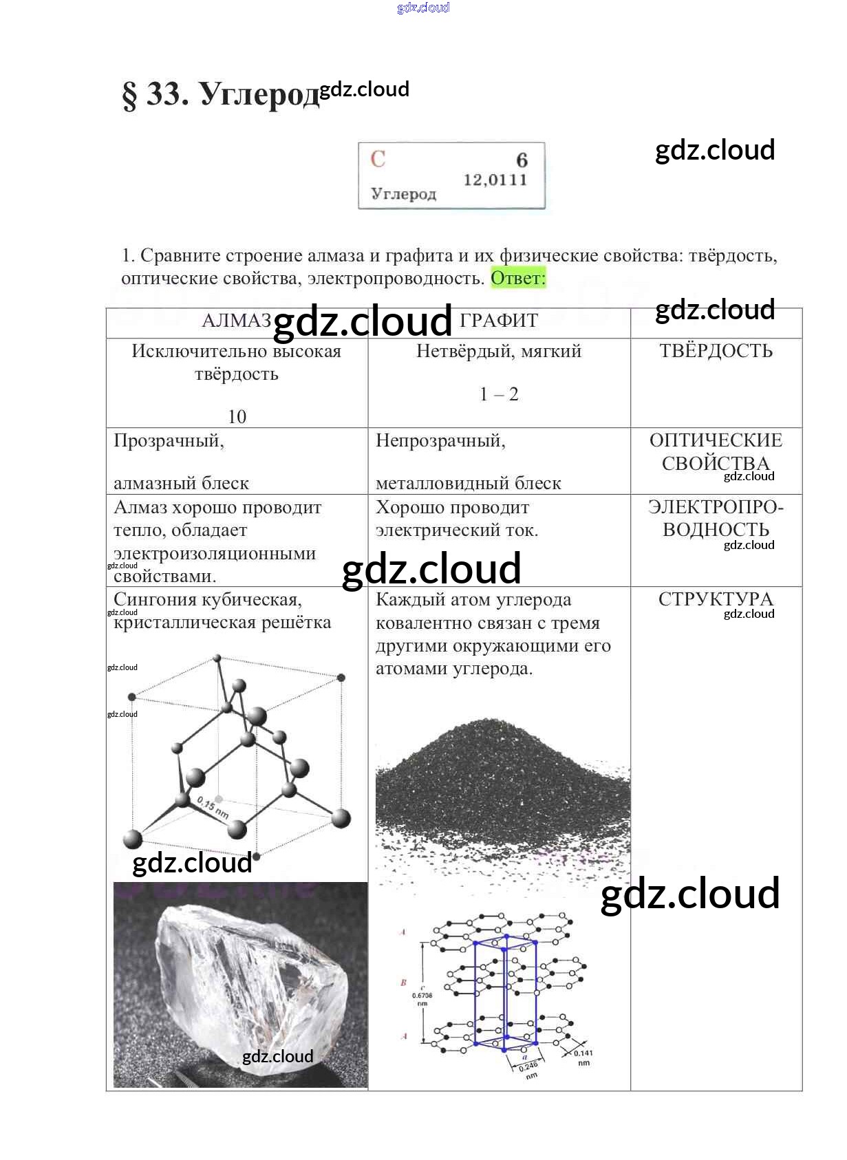 Ответы к §33. Углерод по Химии 9 класс Учебник Габриелян Вертикаль Дрофа