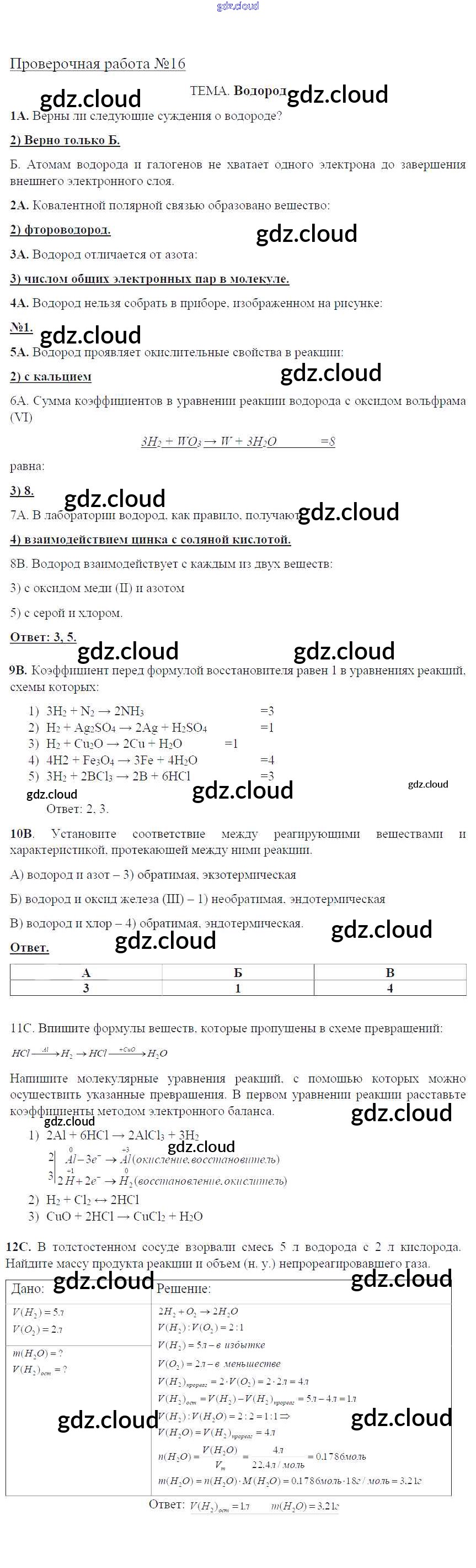 Ответ на задание ПР-16. Водород Тетрадь для оценки качества знаний Химия за 9 (девятый) класс Габриелян, Крупцова Вертикаль 2017