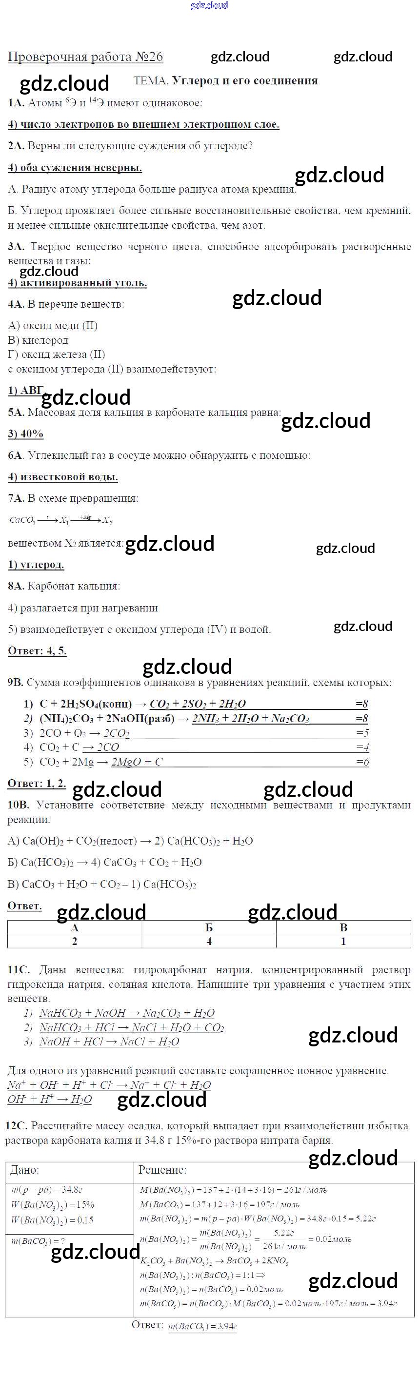 Ответ на задание ПР-26. Углерод и его соединения Тетрадь для оценки качества знаний Химия за 9 (девятый) класс Габриелян, Крупцова Вертикаль 2017