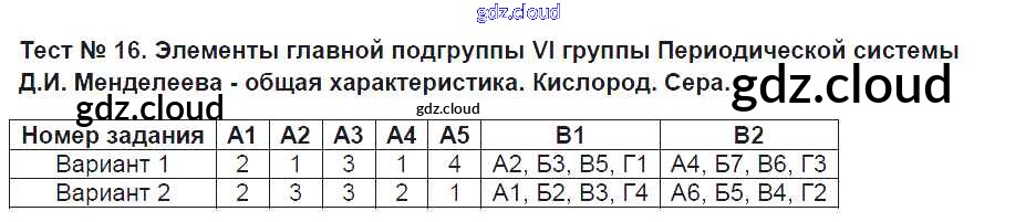 Ответ на задание Тест №16. Элементы главной подгруппы vi группы Периодической системы Д.И. Менделеева - общая характеристика. Кислород. Сера Контрольно-измерительные материалы (КИМ) Химия за 9 (девятый) класс Стрельникова 2017