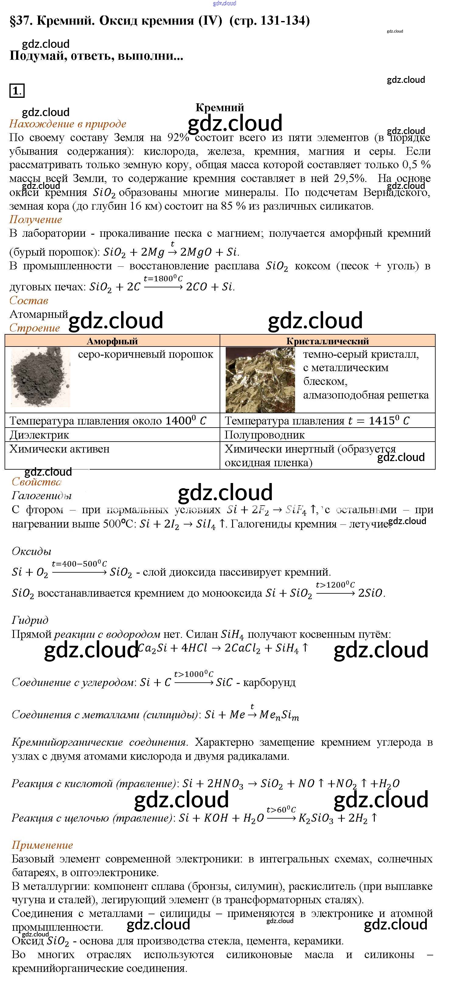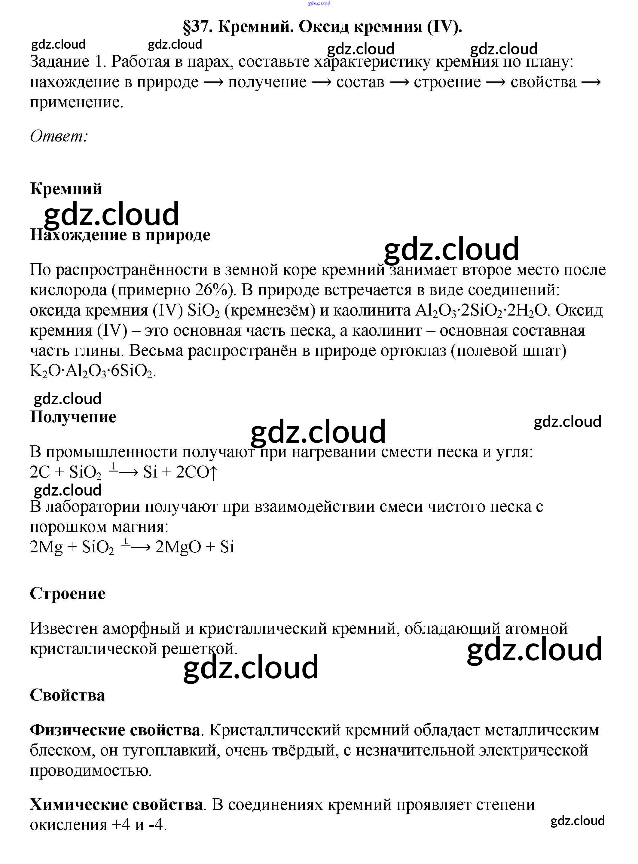 § 37. Кремний. Оксид кремния (IV) Ответы к новому изданию по Химии 9 класс Учебник Рудзитис УМК Просвещение