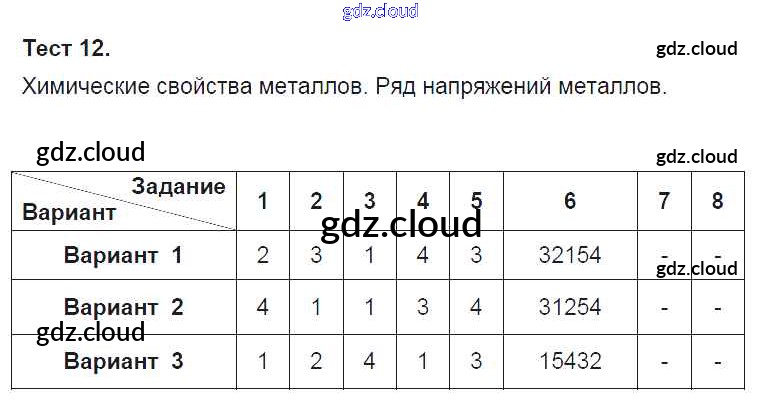 Ответ на задание Тест-12. Химические свойства металлов. Ряд напряжений металлов Тесты Химия за 9 (девятый) класс Боровских УМК 2013