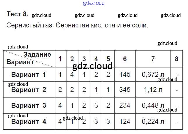 Ответ на задание Тест-8. Сернистый газ. Сернистая кислота и её соли Тесты Химия за 9 (девятый) класс Боровских УМК 2013
