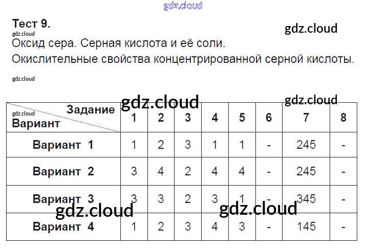 Ответ на задание Тест-9. Оксид сера. Серная кислота и её соли Тесты Химия за 9 (девятый) класс Боровских УМК 2013