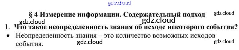 Ответы к §4. Измерение информации. Содержательный подход по Информатике 10 класс Учебник Семакин Базовый уровень Бином