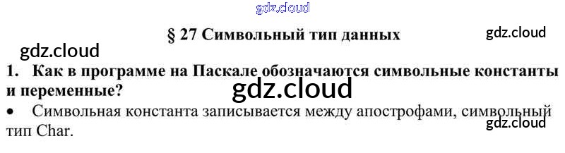 Ответы к §27. Символьный тип данных по Информатике 10 класс Учебник Семакин Базовый уровень Бином