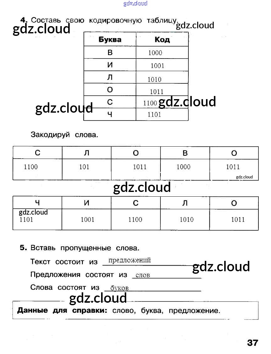 Ответ на задание стр. 37 Рабочая тетрадь Информатика за 2 (второй) класс Матвеева, Челак, Конопатова, Панкратова, Нурова УМК 2012 Часть 1, 2