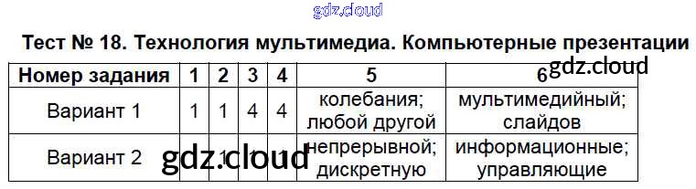Ответ на задание Тест №18. Технология мультимедиа. Компьютерные презентации Контрольно-измерительные материалы (КИМ) Информатика за 7 (седьмой) класс Масленикова 2017
