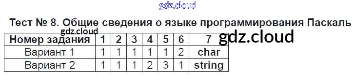 Ответ на задание Тест №8. Общие сведения о языке программирования Паскаль Контрольно-измерительные материалы (КИМ) Информатика за 8 (восьмой) класс Масленикова 2017