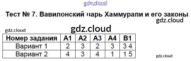 Ответ на задание Тест №7. Вавилонский царь Хаммурапи и его законы Контрольно-измерительные материалы (КИМ) История за 5 (пятый) класс Волкова 2017