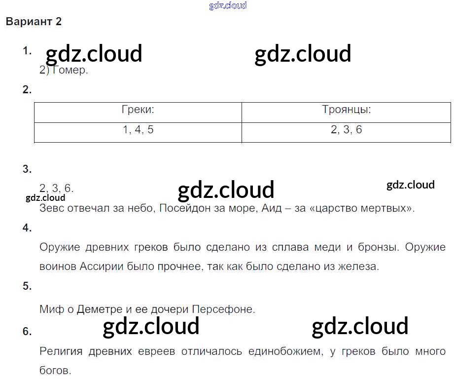 Ответ на задание Вариант №2 Проверочные и контрольные работы История за 5 (пятый) класс Крючкова 2015