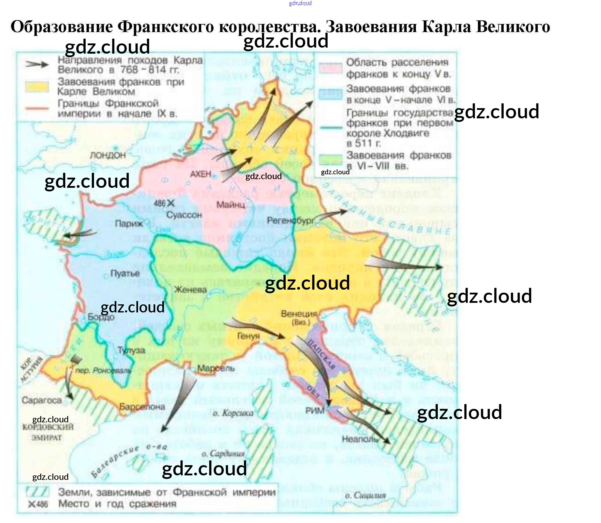 Вопросы к карте § 1. Образование варварских королевств. Государство франков в VI-VIII веках по Истории 6 класс Учебник Агибалова Просвещение