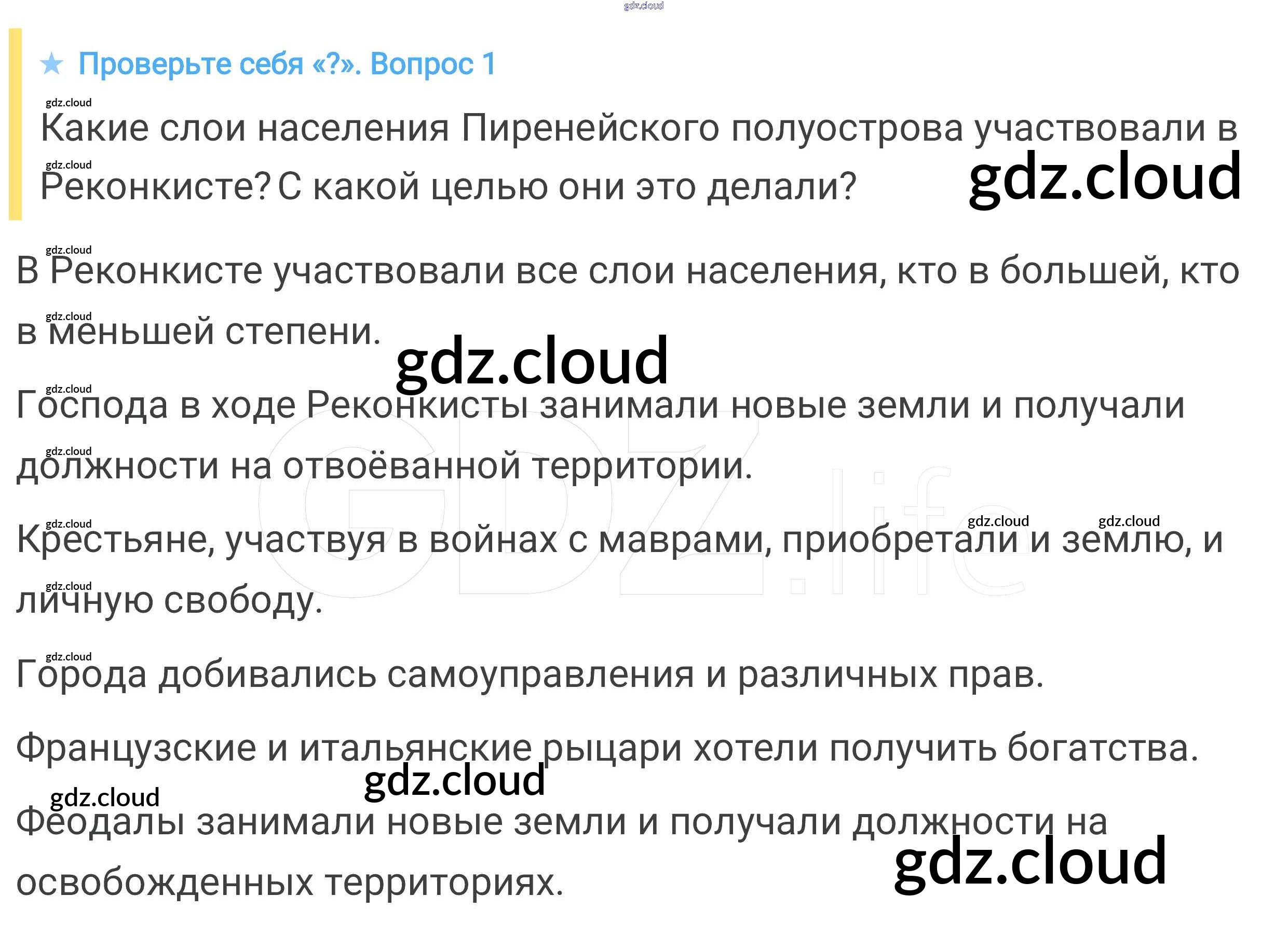 Проверьте себя § 22. Реконкиста и образование централизованных государств на Пиренейском полуострове по Истории 6 класс Учебник Агибалова Просвещение