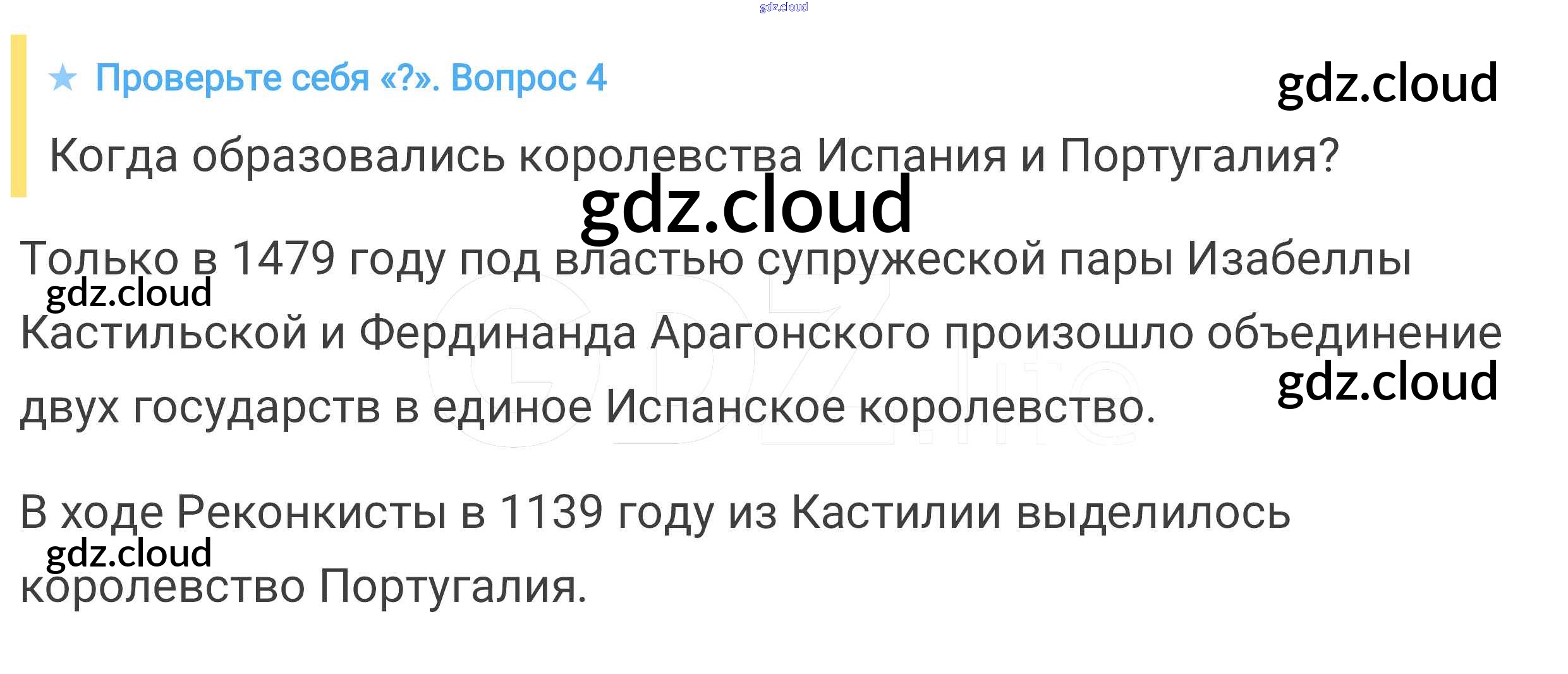 Проверьте себя § 22. Реконкиста и образование централизованных государств на Пиренейском полуострове по Истории 6 класс Учебник Агибалова Просвещение