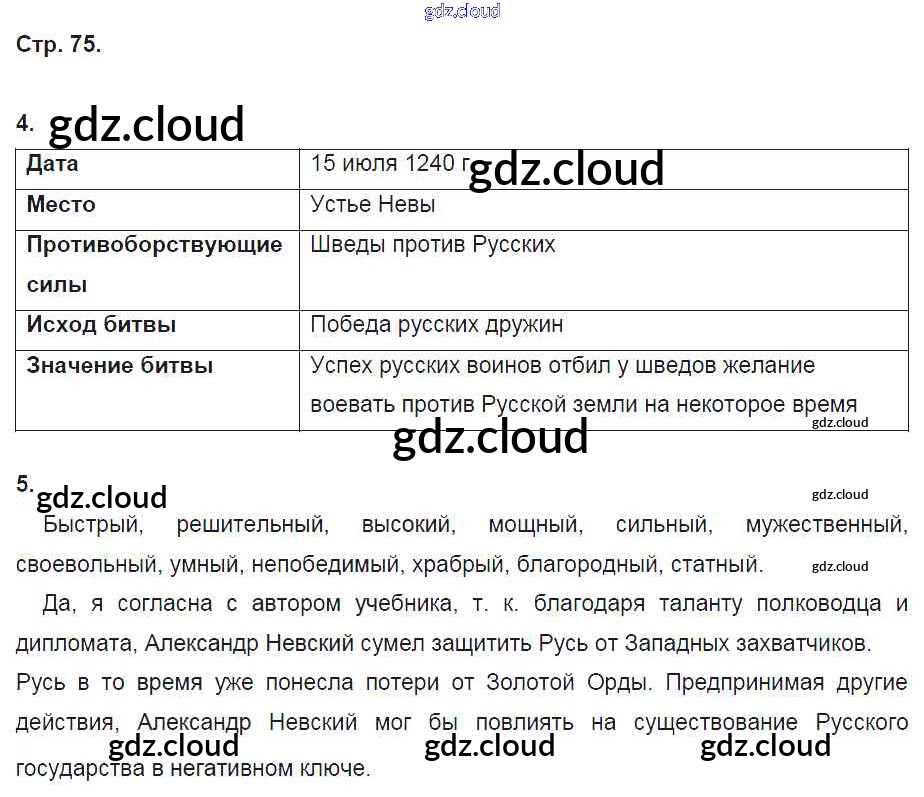 Ответ на задание стр. 75 Рабочая тетрадь История за 6 (шестой) класс Артасов, Данилов, Косулина, Соколова 2016