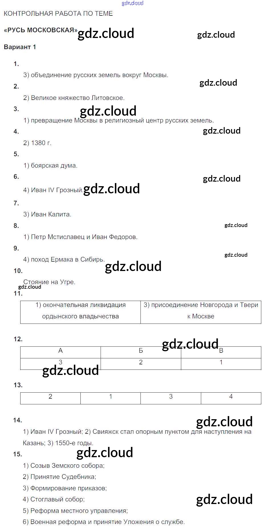 КР. Русь Московская Ответы к теме Русь Московская по Истории 6 класс Тематический контроль Артасов Национальное образование
