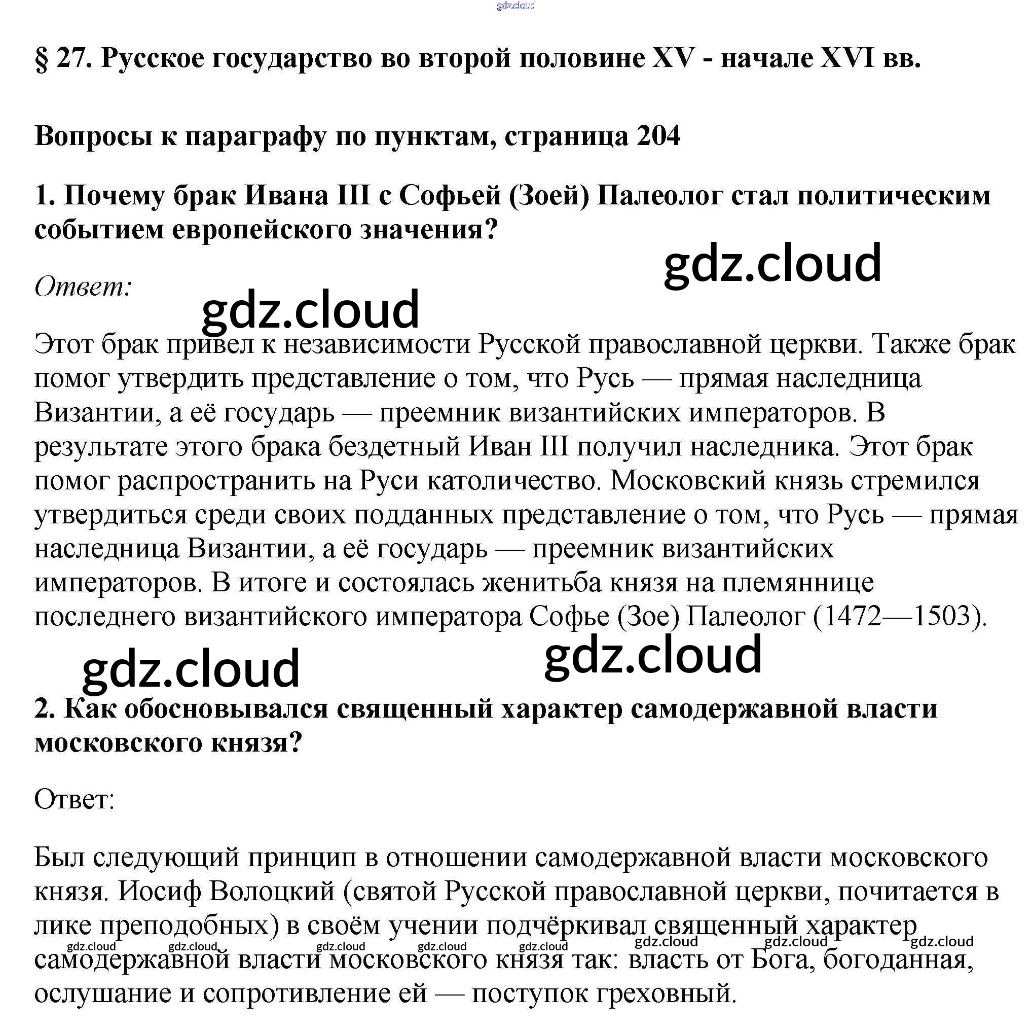 §27. Русское государство во второй половине XV - начале XVI вв. Учебник 2016 (ответы) по Истории 6 класс Учебник Андреев Вертикаль Дрофа, Дрофа