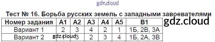 Ответ на задание Тест №16. Борьба русских земель с западными завоевателями Контрольно-измерительные материалы (КИМ) История за 6 (шестой) класс Волкова 2017