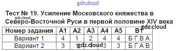 Ответ на задание Тест №19. Усиление Московского княжества в Северо-Восточной Руси в первой половине XIV века Контрольно-измерительные материалы (КИМ) История за 6 (шестой) класс Волкова 2017