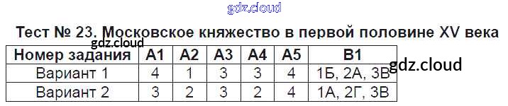 Ответ на задание Тест №23. Московское княжество в первой половине XV века Контрольно-измерительные материалы (КИМ) История за 6 (шестой) класс Волкова 2017