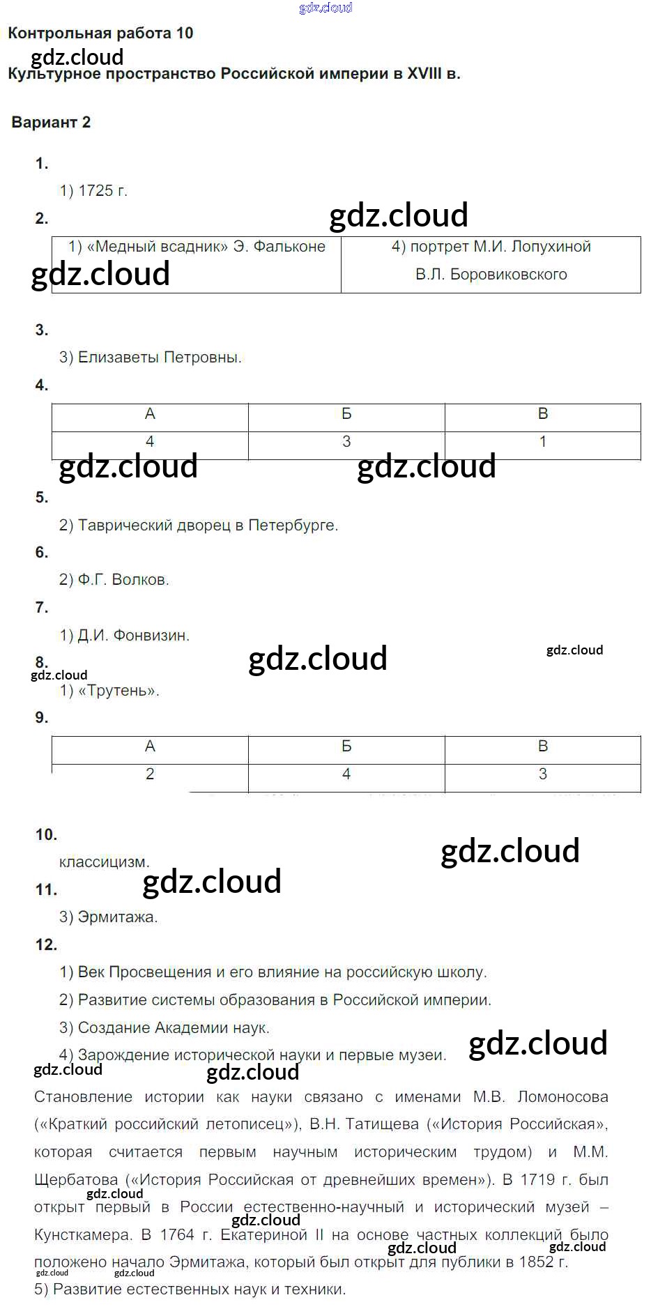 Ответы к КР-10. Варианты по Истории 8 класс Контрольные работы Соловьев УМК Экзамен