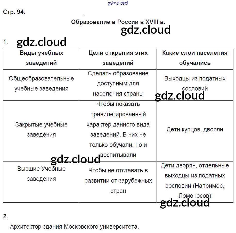 Ответ на задание 94 Рабочая тетрадь История за 8 (восьмой) класс Артасов, Данилов, Косулина, Соколова УМК 2016 ФГОС онлайн и без номера телефона.