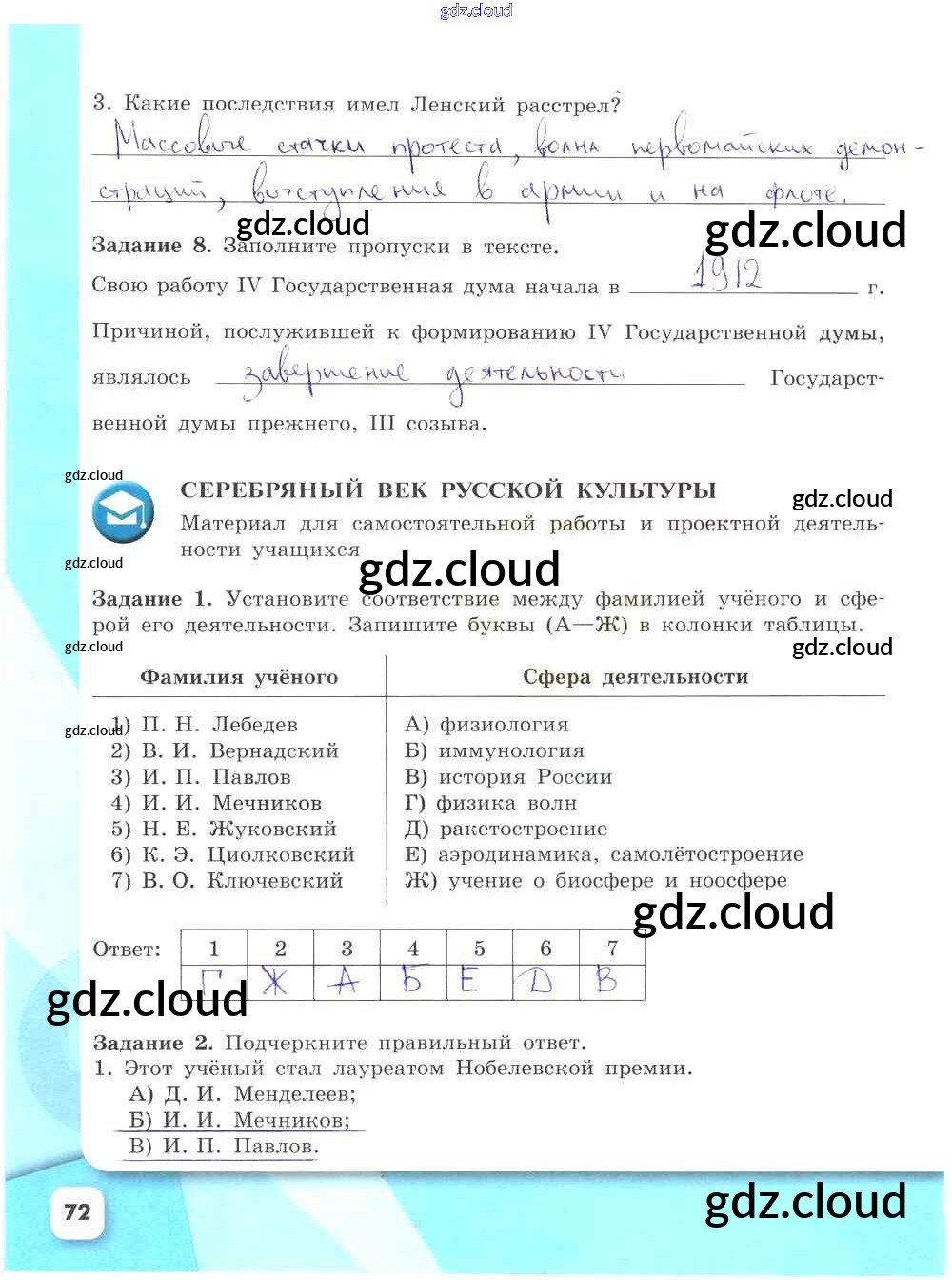 Ответ на задание стр.72 Рабочая тетрадь История за 9 (девятый) класс Данилов, Косулина, Лукутин, Макарова УМК 2017 Часть 1, 2