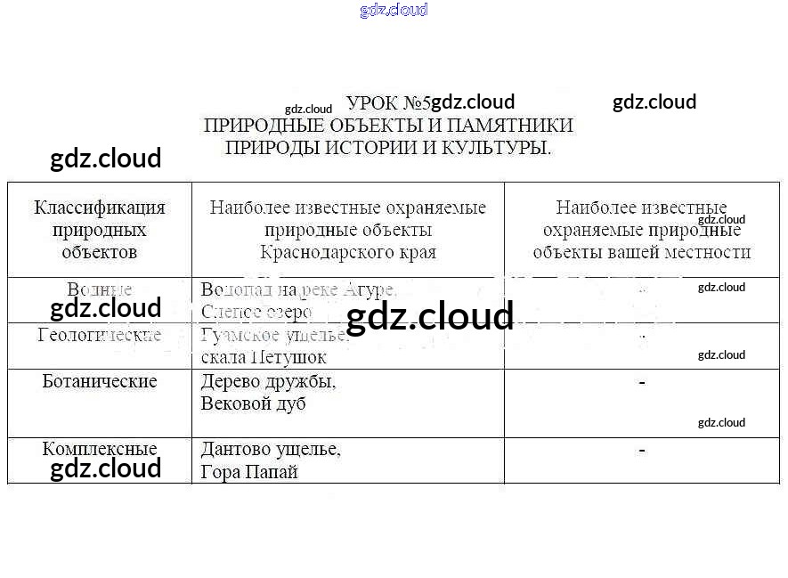 Ответы к Уроку № 5. Природные объекты и памятники природы истории и культуры по Кубановедению 6 класс Рабочая тетрадь Голикова Традиция