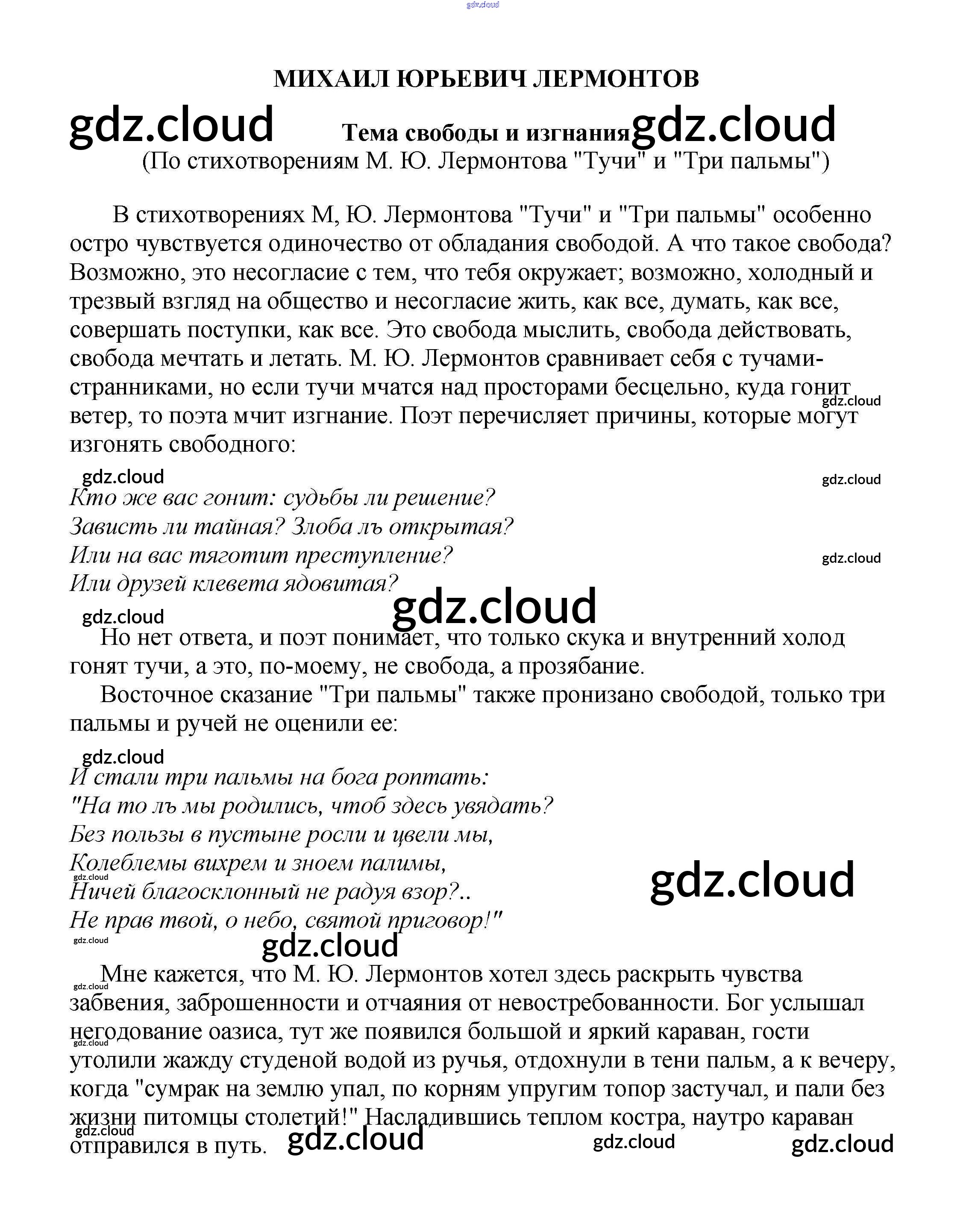 Ответ на задание Тема свободы и изгнания (По стихотворениям М. Ю. Лермонтова "Тучи" и "Три пальмы") Сочинения Литература за 5, 6, 7, 8, 9, 10 (пятый, шестой, седьмой, восьмой, девятый, десятый) класс Белик, Музычук 2017